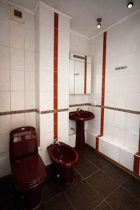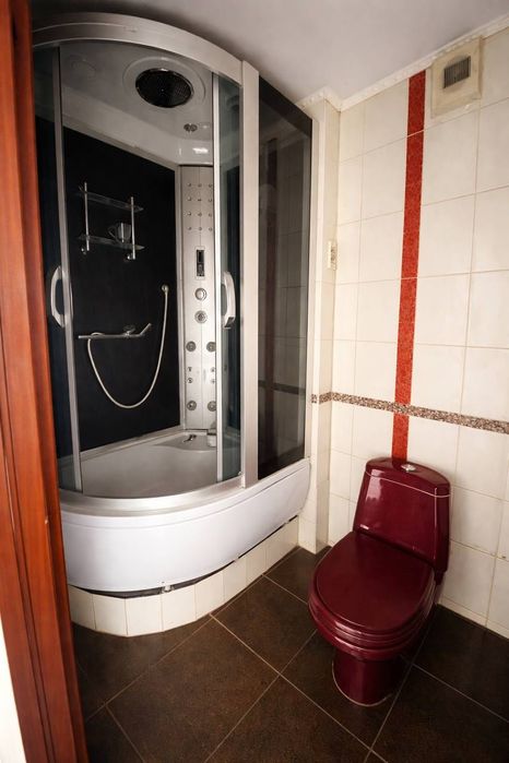 Санвузол суміжний, оздоблений плиткою, облаштований душовою кабіною та біде.