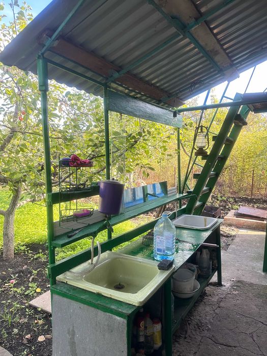 До будинку прибудована цегляна літня кухня. Там плита і холодильник. Майже весь час з весни по осінь проводили в ній. Над виходами широкий навіс з металочерепиці – можна вільно знаходитись, готувати під час дощу (особливо романтично:). Тут же дві раковини і широка поверхня для готування і тому подібного. Йде чиста питна вода – напір води, як правило, хороший. Поливна вода також є, з минулого року стоять нові труби. Цементована площадка і доріжки до вулиці і бані, туалету і душу. Лічильники на світло і воду. Інтернет з Wi-Fi.