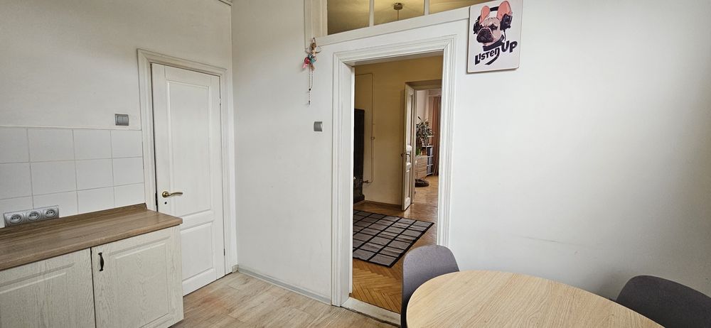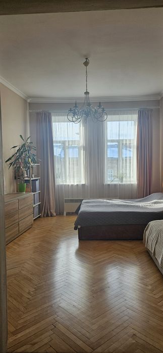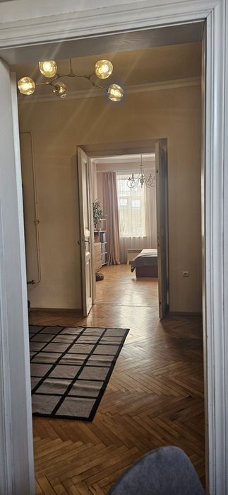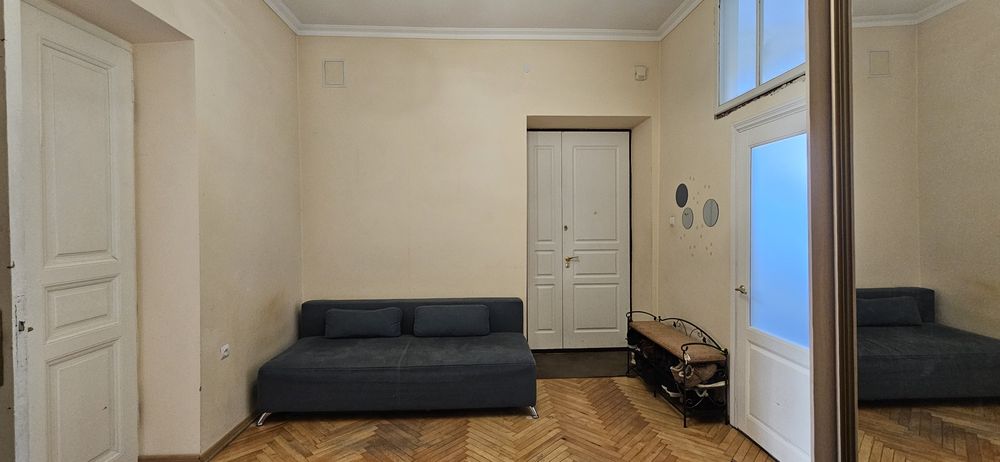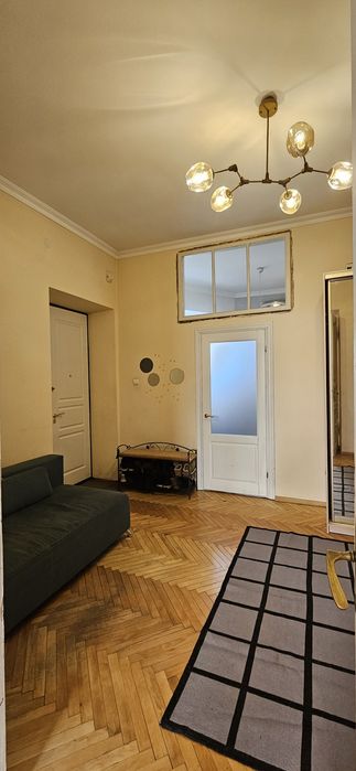 Вхід з під'їзду у кімнату-вітальню 15.6 мкв зліва кухня 8.2 мкв (вікно в двір), справа велика світла спальня 20.4 мкв (вікна на Личаківську)