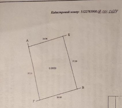 Форма ділянки: Зручна для планування будівництва (сторони: 24.96м та 26.85м по фасаду/тилу, 37.00м та 37.11м по боках).