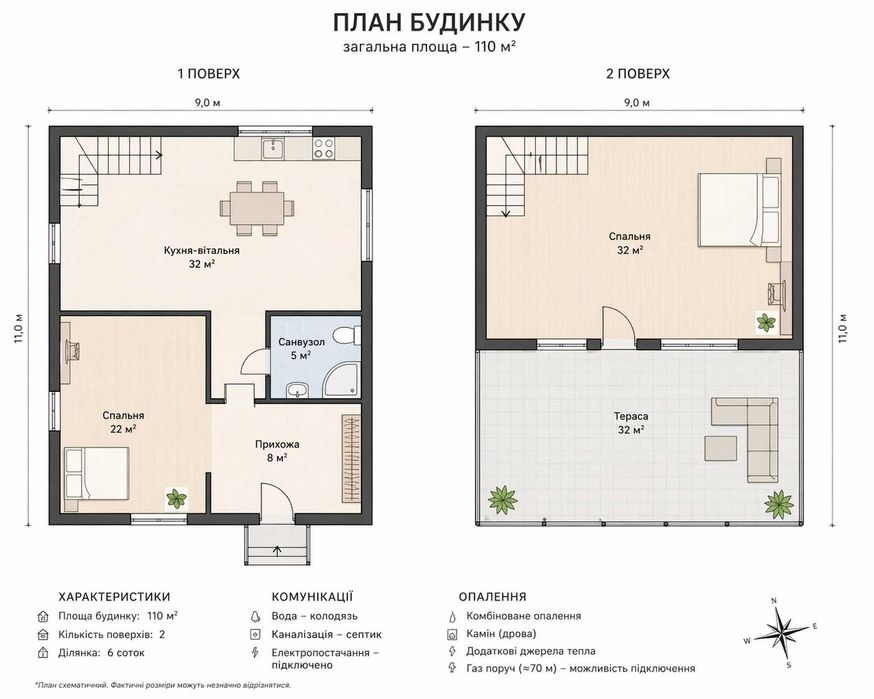 Будинок має 2 поверхи, загальна площа — 110 м².