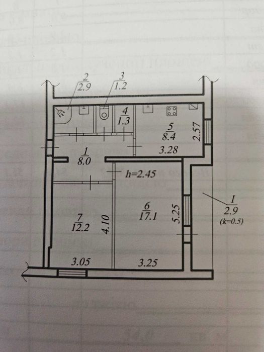 Загальна площа 54 м²; житлова 29,3м²; коридор 8м², кухня 8,4 м², 1-а кімната- 17,1 м²,