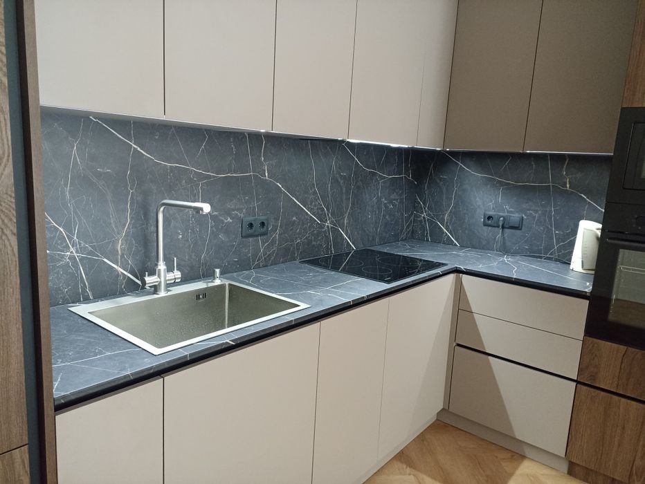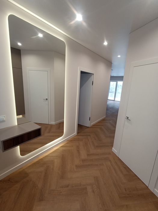 Тепла підлога по всьому периметру,найсучасніший вініловий паркет ялинкою,що не боїться вологи і пошкоджень і проводить тепло краще ламінату.Ретельно підібрана побутова техніка(інверторний холодильник і кондиціонер,індукційна плита,вбудовані посудомийка,мікрохвильовка та духова шафа відомих брендів,витяжка з безконтактним сенсором.Панорамні вікна з кухні-студії та спальні виходять на задній двір де можна облаштувати барбекю зону,невеликий басейн та шезлонги,(світло,вода та каналізація виведені)