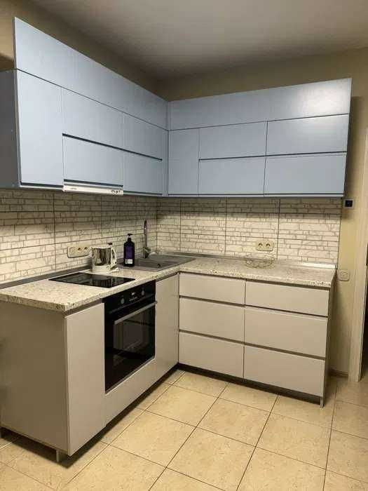 Кухня (12,1 кв.м) — простора, можна облаштувати додаткове спальне місце або дитячий куточок. Є духова шафа, варильна поверхня та витяжка. Холодильник відсутній, але за потреби можна придбати без зміни ціни оренди. Меблі включають кухню, обідній стіл та два крісла.