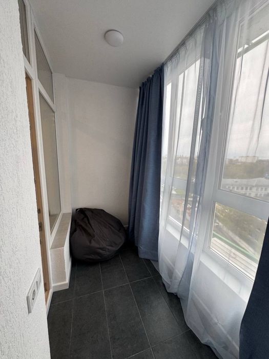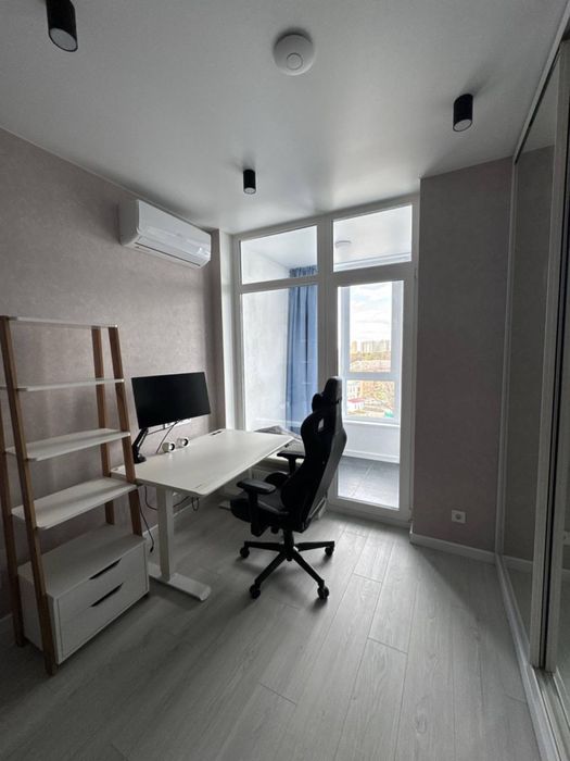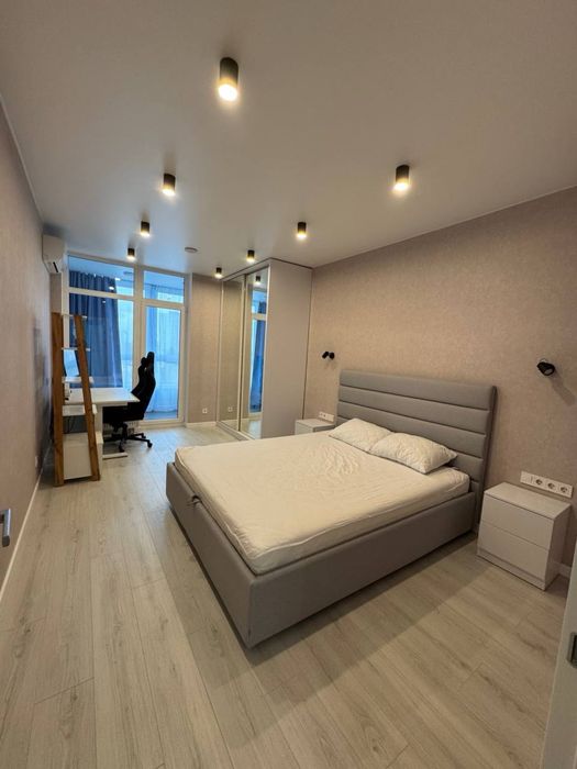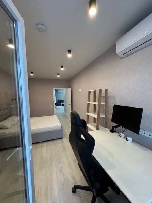 Планування продумане та функціональне. Простора спальня облаштована як для відпочинку, так і для роботи: тут є велике двоспальне ліжко, великий робочий стіл із регулюванням висоти, комфортне ігрове крісло, а також розкладний диван довжиною 2 метри, який зручно використовувати для гостей. Із кімнати є вихід на великий балкон із приємним видом на місто. У спальні також встановлено кондиціонер, а для зберігання речей передбачена велика шафа-купе з дзеркалом.