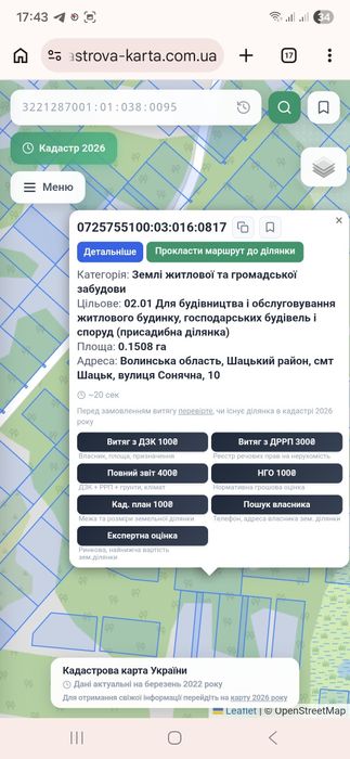 Продам земельну ділянку 0,15га в смт. Шацьк; Продам земельну ділянку 0,1508га в смт. Шацьк, вул. Сонячна, 10, з цільовим призначенням для будівництва і обслуговування житлового будинку, господарських будівель і споруд, кадастровий номер 0725755100:03:016:0817.