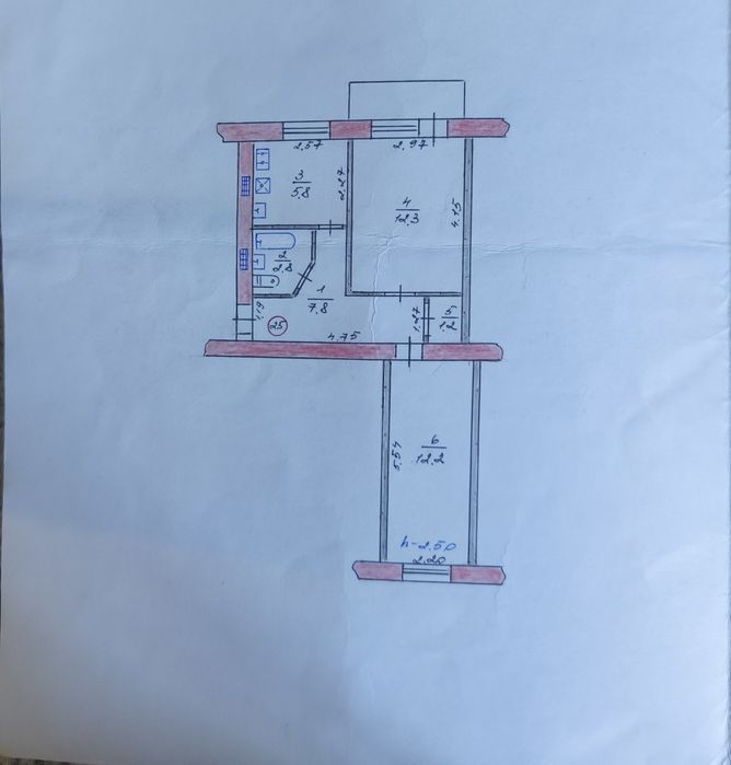 Кухня — 5,8 м², коридор — 7,8 м², є комора 1,2 м².
