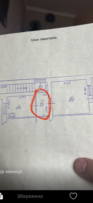 Ямниця 1кім квартира 43,8 м2; На фото плану виділений червоним спільний коридор