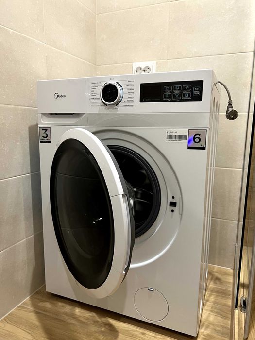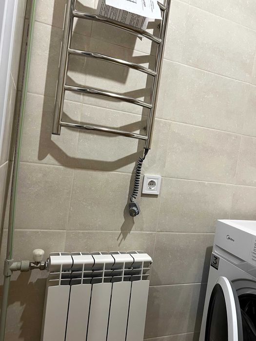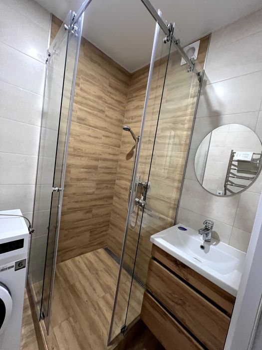 - у ванній кімнаті знаходить нова пральна машинка, душова кабіна, умивальник та тумба, сушарка для рушників
