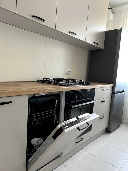 - сучасна велика нова кухня з новою технікою: посудомийна машина, духовка, газова плита . Стіл, 4 стільці