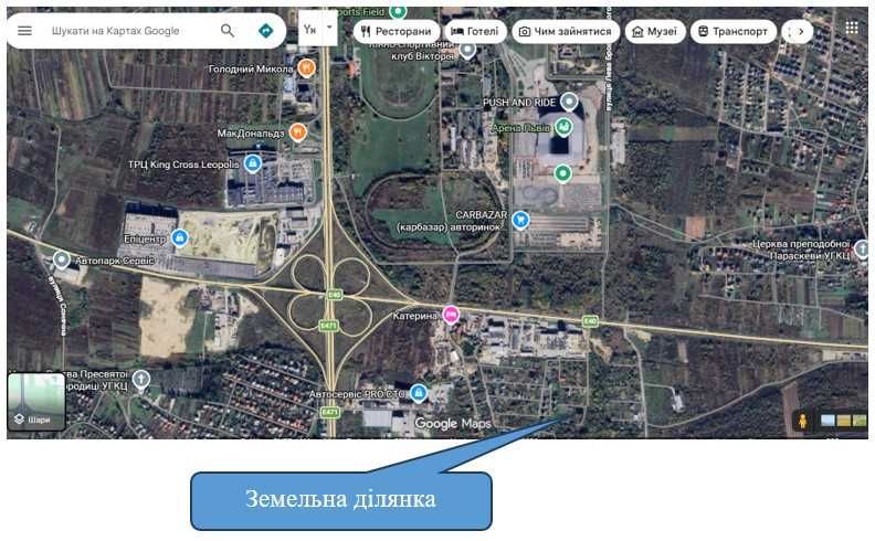 земельна ділянка Солонка, Львів Арена; земельна ділянка 01.06 садівництво; 7,22 сотки, межує з ставком , дорога з твердим насипом з об'їзної траси , напроти Львів арена, позаду готель Катерина, кадастровий номер 4623686600:04:000:3061, межує з ділянками , що переведені в житлову забудову, локація активно забудовується