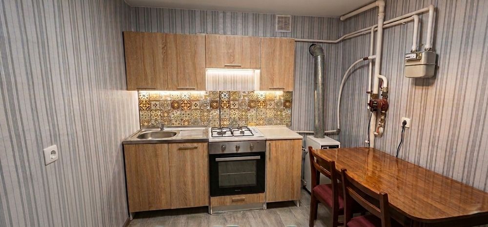 Техника и мебель: Новый большой холодильник, стиральная машина-автомат, бойлер, качественная кухонная зона.