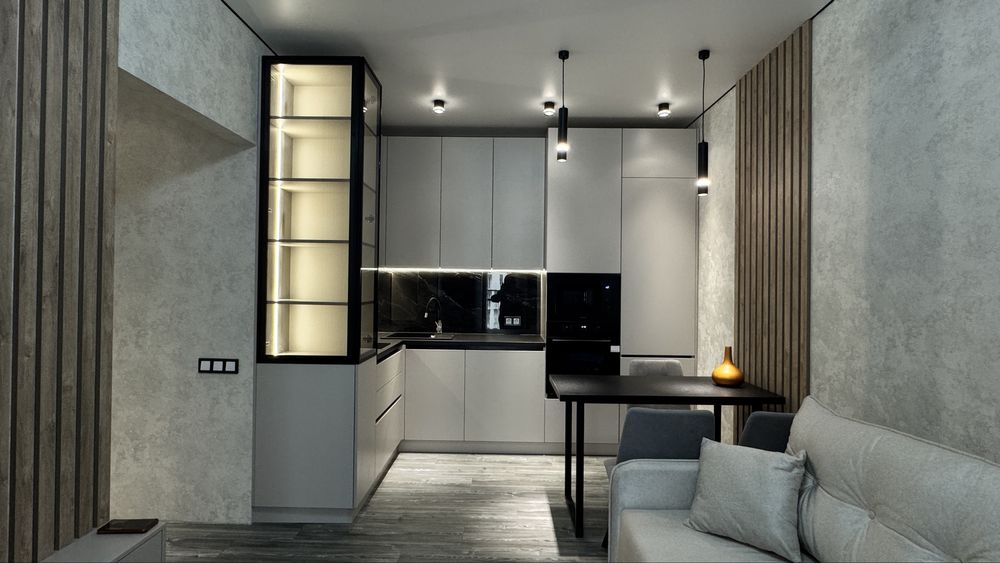 Кухня студія з меблями, вбудованою технікою, розкладним диваном та телевізором.