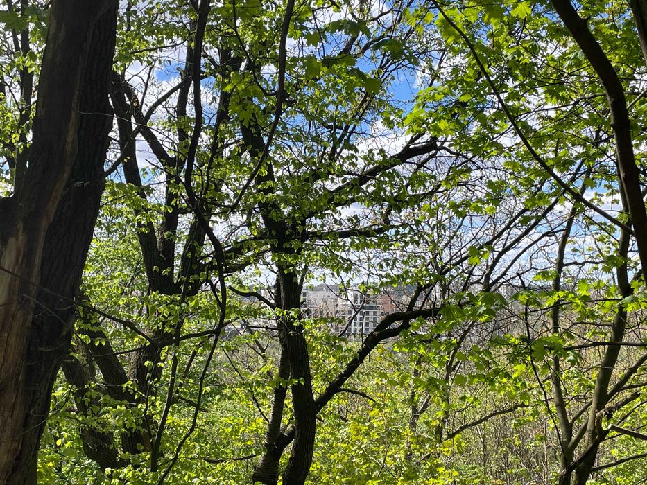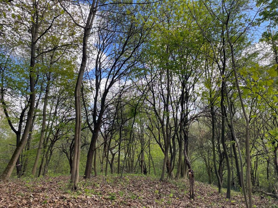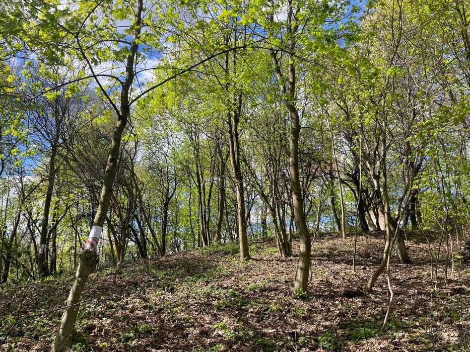 Ділянка розташована на пагорбі з виглядом на місто, на ділянці багато дерев (всі фотографії зроблені на ділянці), практично межує з Брюховицьким лісопарком і через дорогу озеро Стосика :