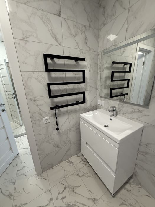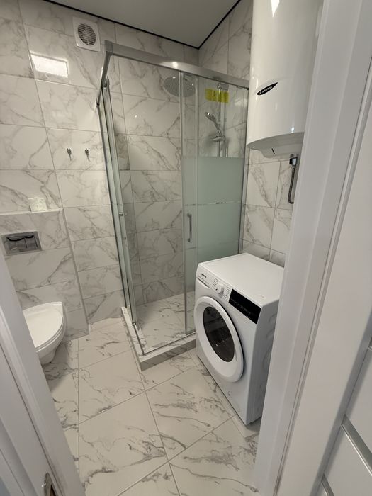 У ванній кімнаті: душова кабіна, прально-сушильна машина, умивальник та шкаф для зберігання, вбудована інсталяція. У ванній кімнаті змонтовано теплу підлогу.