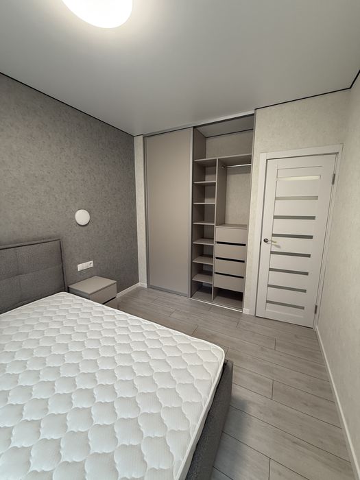 Квартира повністю готова до проживання та укомплектована меблями та технікою. В кімнаті знаходиться двоспальне ліжко з нішою для зберігання та прикроватними тумбами та вбудованою шафою для одягу. В самій кімнаті додатково зроблено шумоізоляцію стін.