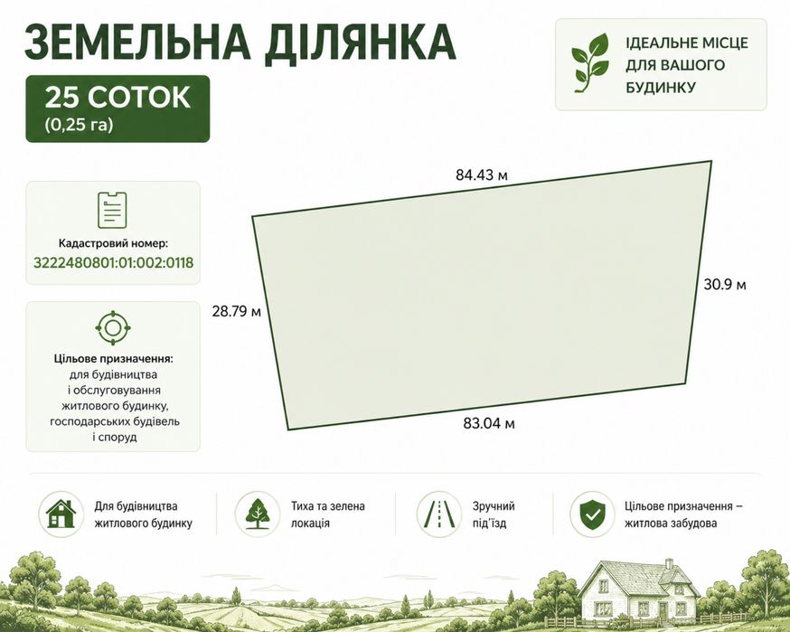 * Зручна форма — підходить як для одного будинку, так і для поділу на 2 окремі ділянки
