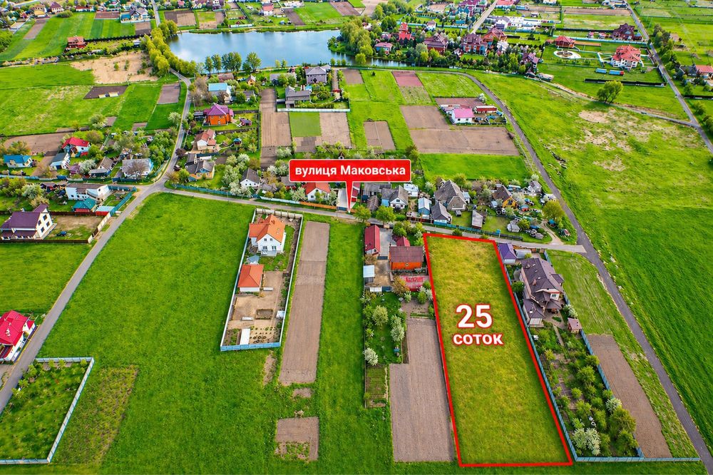 Земельна ділянка 25 соток у с. Бузова (Бучанський район), вул. Маковська; Пропонується рівна земельна ділянка правильної форми площею 25 соток, призначена для будівництва та обслуговування житлового будинку