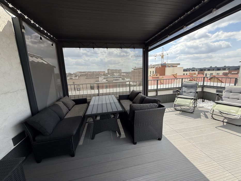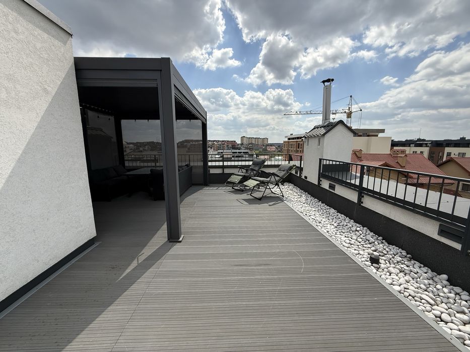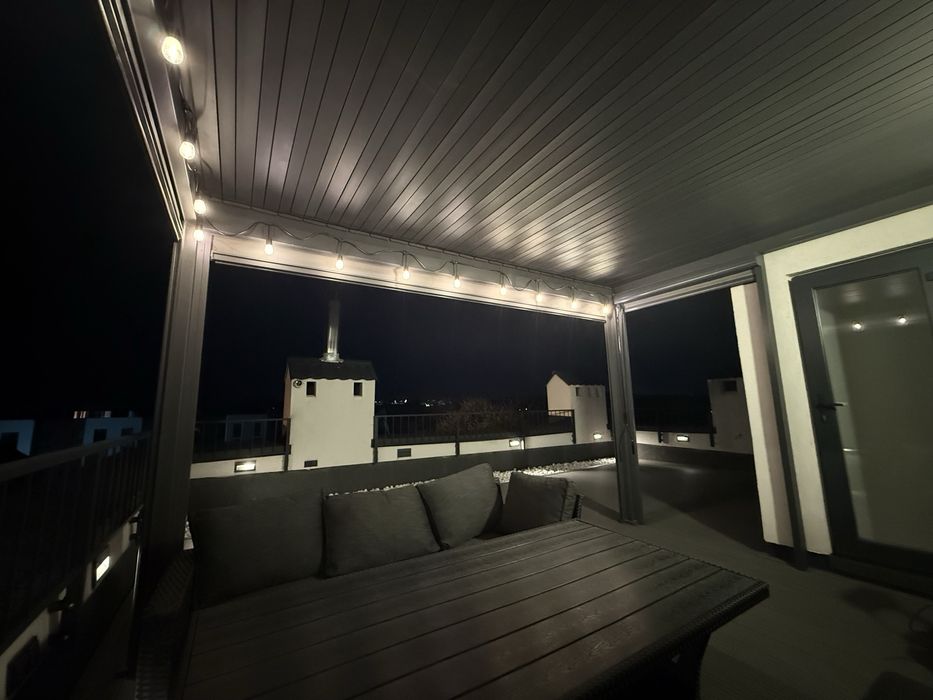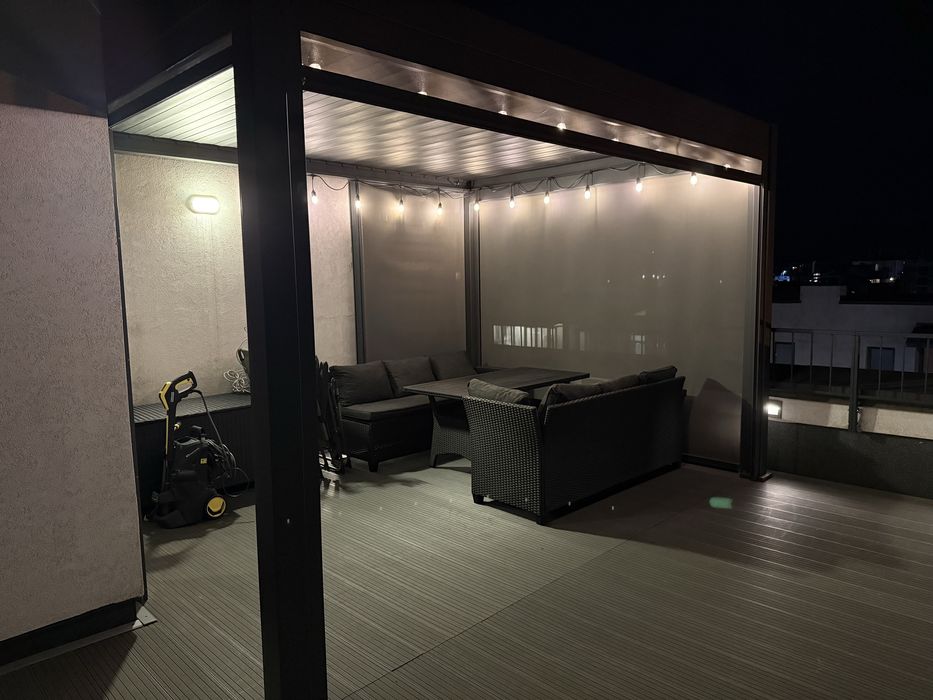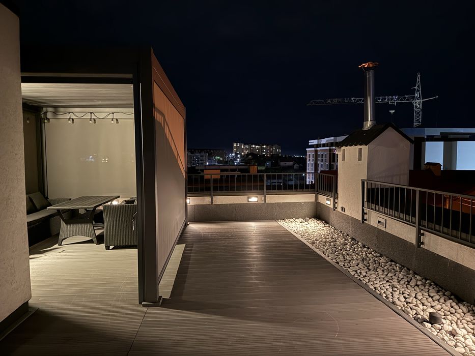 Тераса з підсвіткою, меблями та перголою