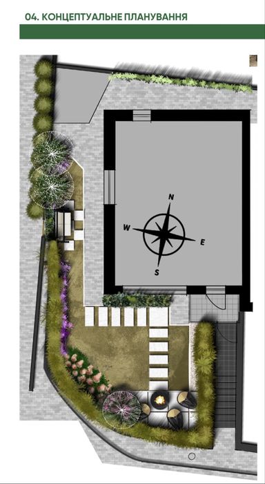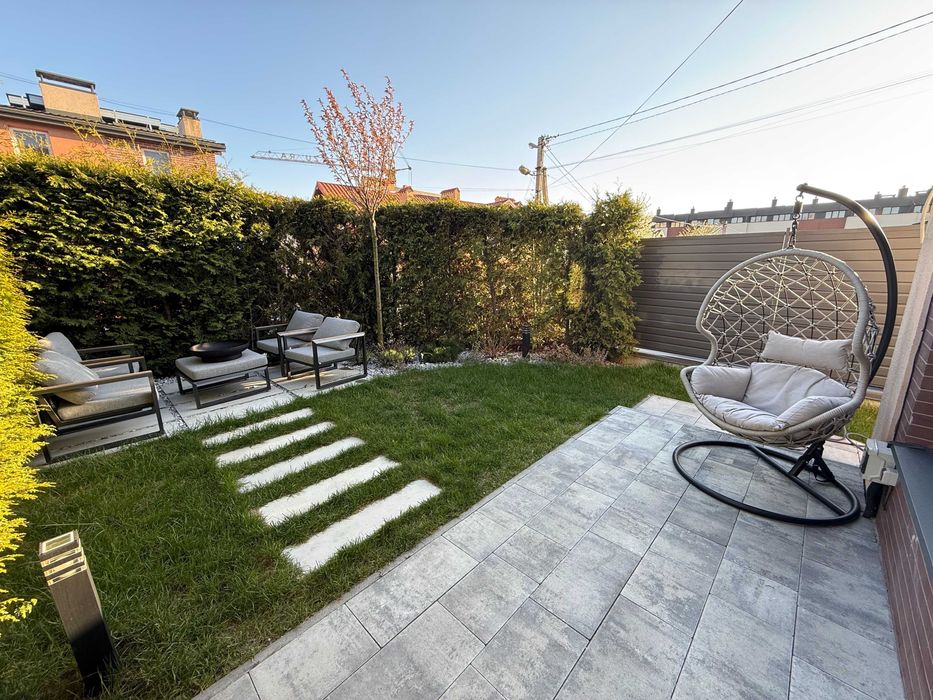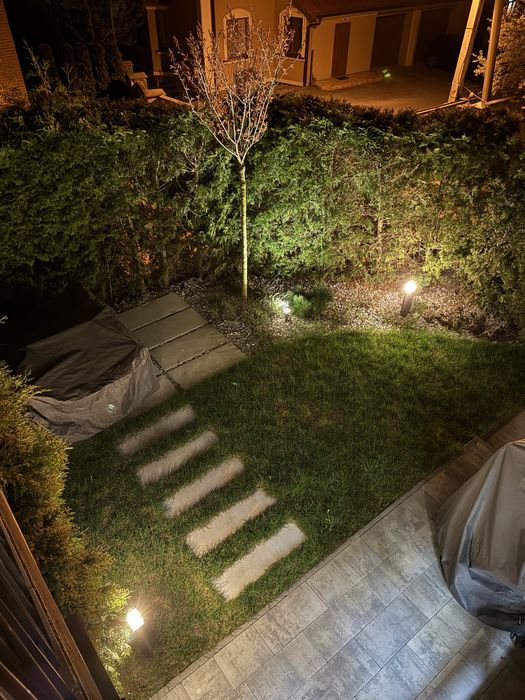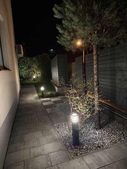 Подвір’я з декоративною підсвіткою та вуличними меблями