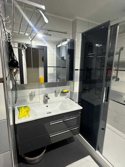 Санвузол суміжний, обладнаний душовою кабіною. Панорамні вікна забезпечують багато природного світла, а інтер’єр виконаний у сучасному лофт-стилі, що додає квартирі особливого характеру.