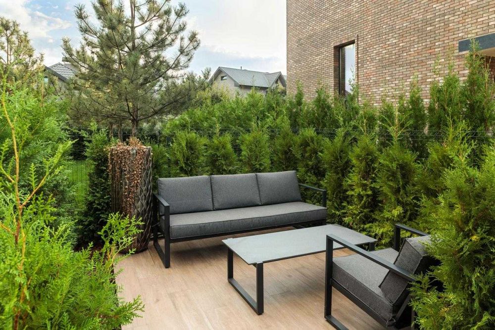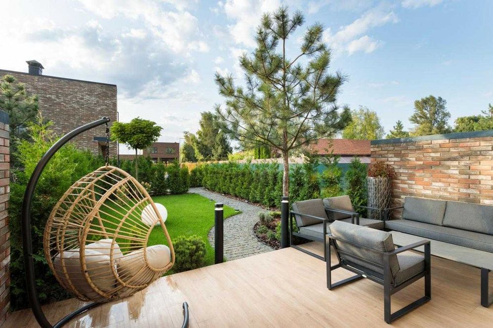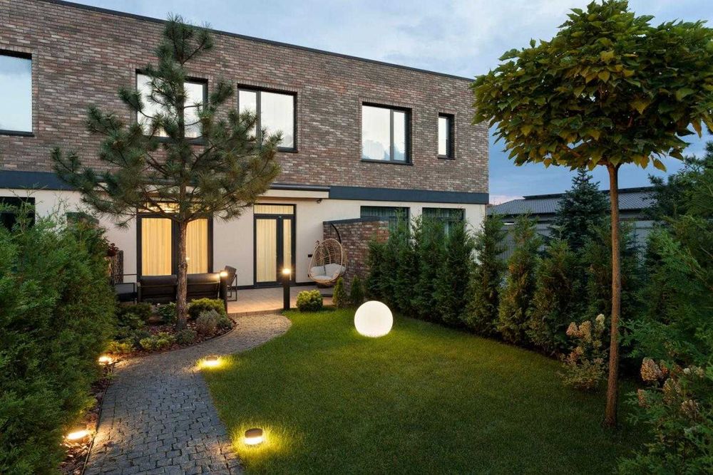 Задній двір з ландшафтним дизайном облаштований системою автоматичного поливу, двома терасами, автоматичною маркізою. Є два паркомісця.