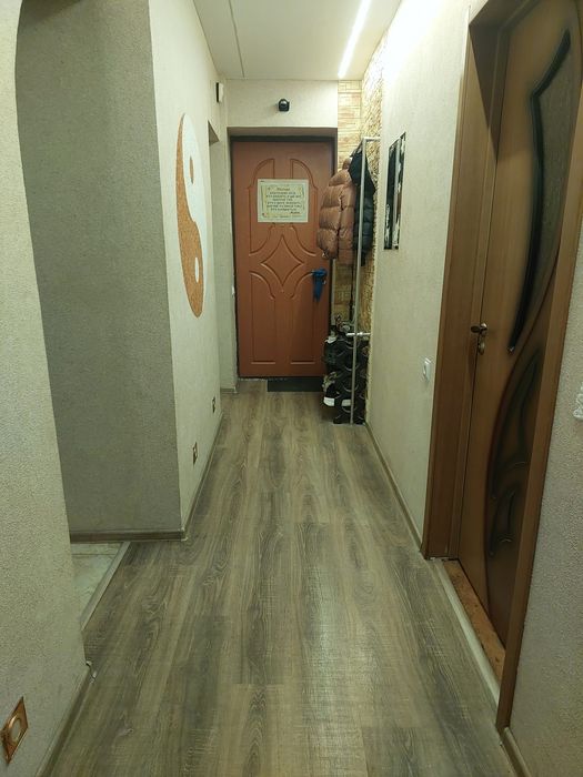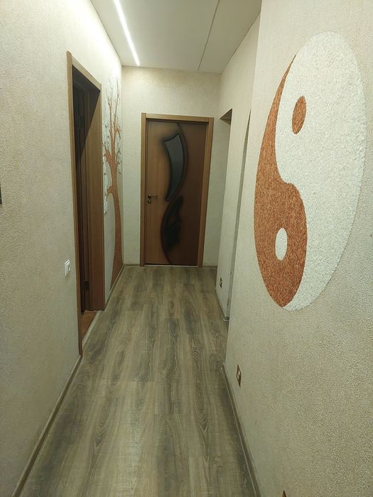 В комнатах жидкие обои, паркет дубовый 10 см толщиной, в коридоре датчик движения.