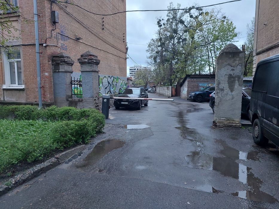 Двор закрытый, на вьезде шлагбаум.
