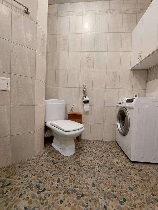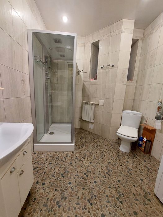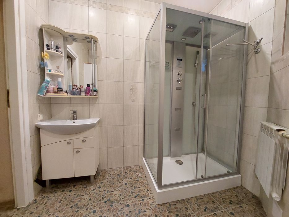 Санузел с двумя окошками, с батареей, пол керамогранит, большая Итальянская душевая кабина с массажным душем, с подсветкой, с вытяжкой, с радио, с wi-fi.