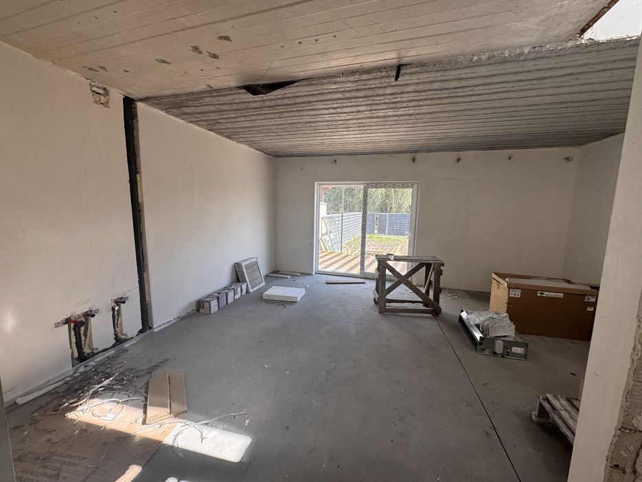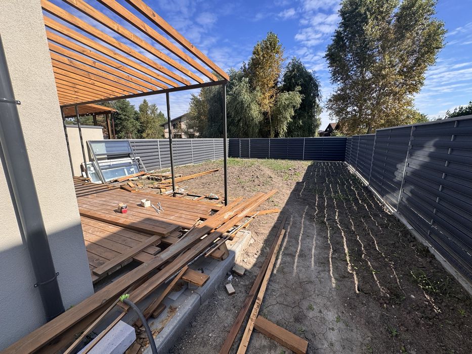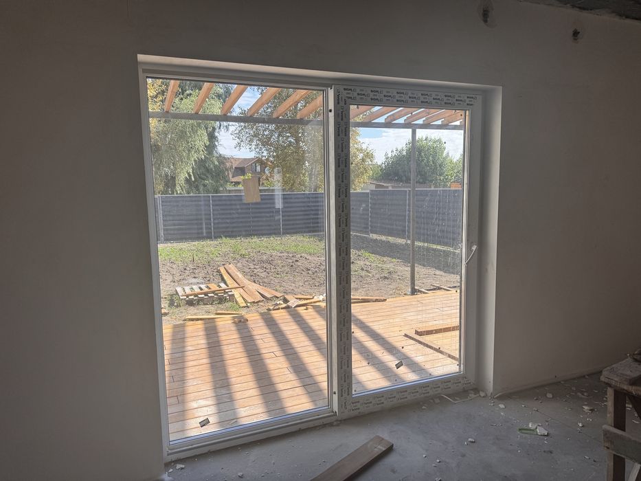Виконані роботи з переносу стін, штукатурка, тепла підлога, сантехніка + роздвіжна система вихід на терасу + тераса + оплачені деревʼяні сходи (бук)+ планування та рівняння ділянки, бордюри