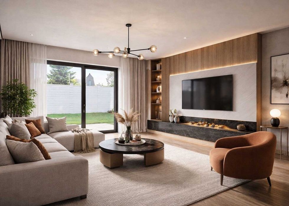 Два этажа, 4 небольшие комнаты, просторная кухня-студия 32 м с выходом на открытую террасу и зеленую зону для отдыха.