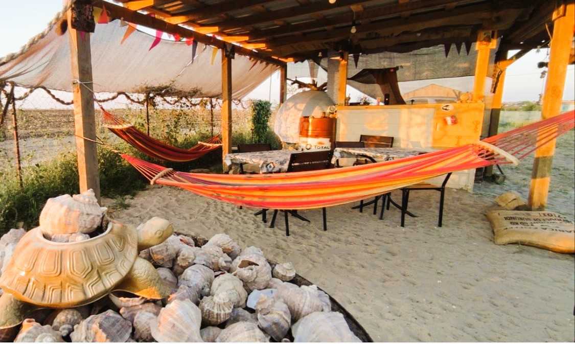 Зона відпочинку під навісом 4х6м з помпейською піччю, гамаками та місцем для приготування барбекю.