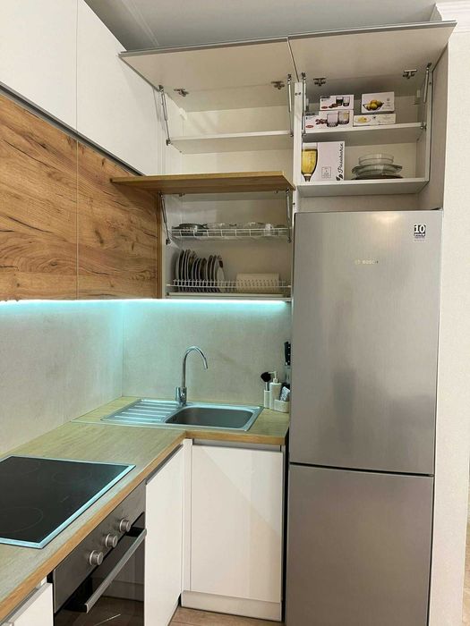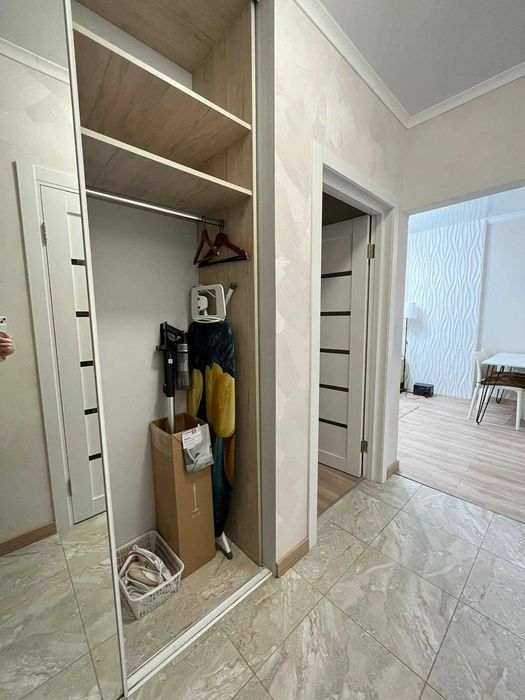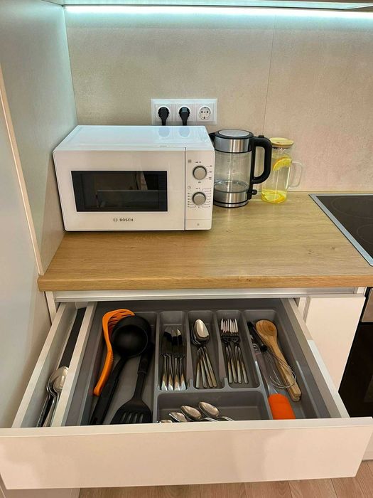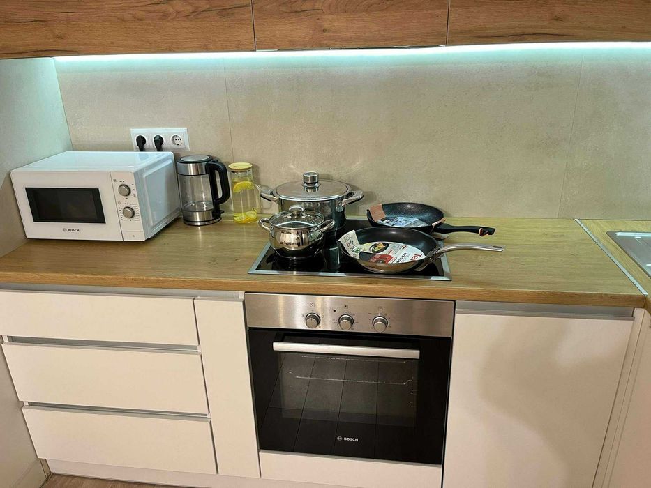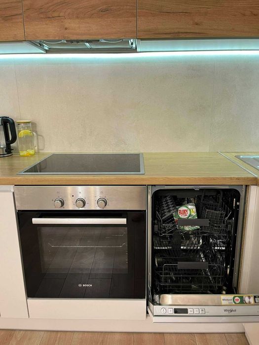 Квартира повністю укомплектована технікою: посудомийна машина Whirlpool, побутова техніка BOSH (пральна машина, плита, духовка, витяжка, мікрохвильовка, холодильник), два кондиціонери Cooper&Hunter з режимом опалення, ручний пилосос Samsung, праска Tefal та прасувальна дошка. Передбачено багато місць для зберігання: дві шафи-купе, окрема шафа на кухні, ТВ-тумба та сейф.