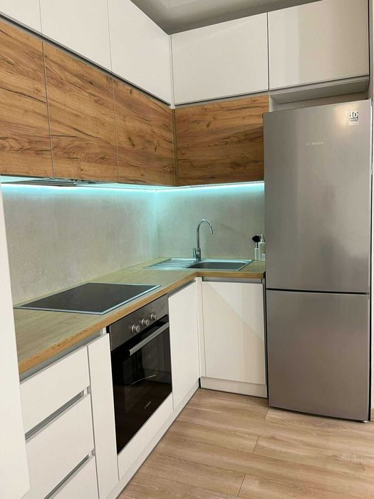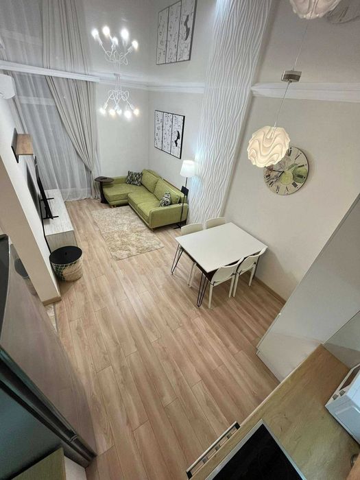 Планування включає кухню-вітальню з кутовим розкладним диваном із місцем для зберігання та телевізором Samsung Smart TV 55". Окрема спальня обладнана двоспальним ліжком 160х200 см з ортопедичним матрацом і шухлядою для речей, великою шафою-купе, комодом та двома приліжковими тумбами.