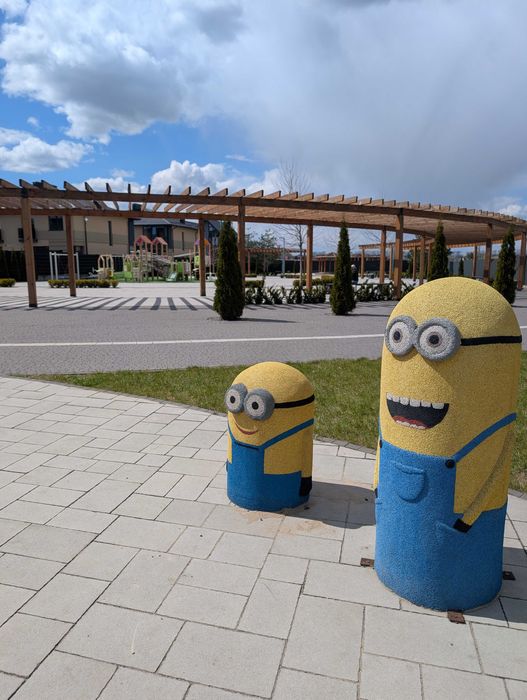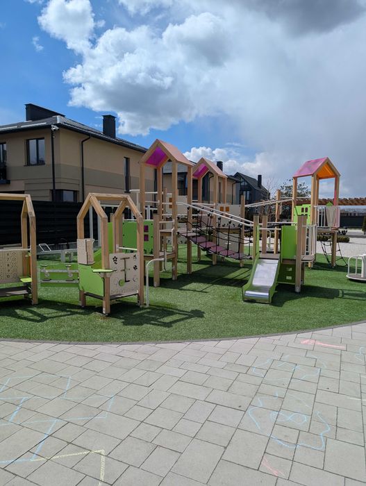 великий простір для прогулянок, зона для роликів, велосипедів, сучасний дитячий майданчик.