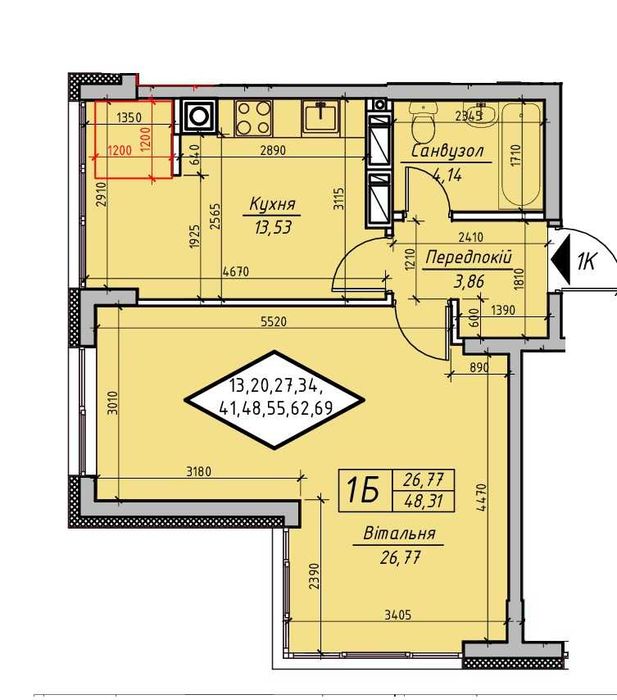 Планування: передпокій – 3,86 кв.м., кухня – 13,53 кв.м., кімната – 26,77 кв.м., суміжний санвузол 4,14 кв.м.
