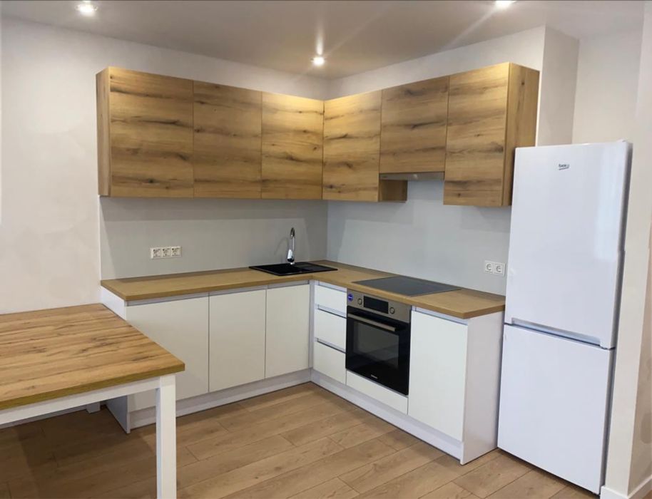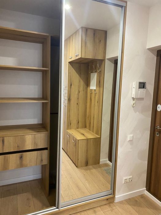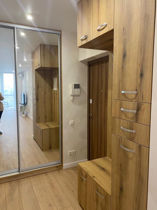 Є багато місця для зберігання речей: простора шафа в передпокої. Сучасна кухня обладнана сучасними меблями та технікою, є обідня зона, зручний диван.