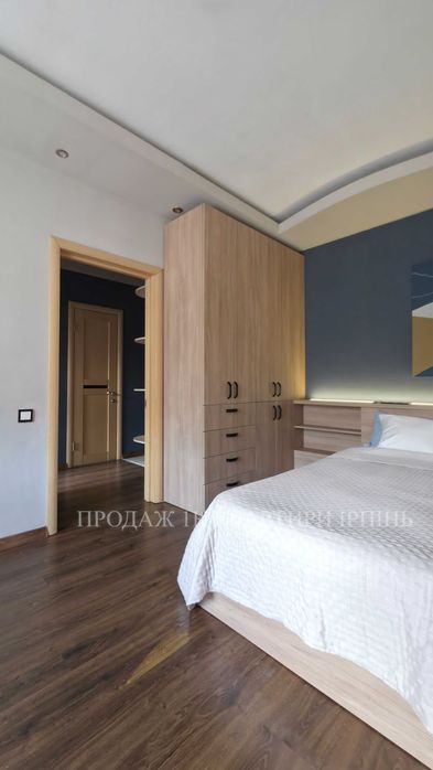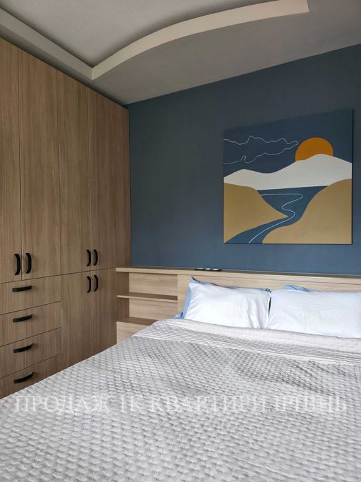 При вході розміщена велика шафа купе з дзеркальними фасадами. Поглиблена кухня виконана на замовлення та має зручний розсувний кухонний фартух з загартованого скла за яким розміщені зручні полиці та сушарка для посуду за мийкою. Також є газова варильна поверхня, витяжка, зручні шухляди та місце під посудомийну машину, мікрохвильову піч. У спальні розміщена велика шафа зі штангами для одягу та висувними шухлядами, яка переходить у широке узголів'я ліжка з полицями та підсвіткою. Також під ліжком (160см*200см) та за ним є додаткове місце для зберігання сезонних речей. Біля вікна розташовний кутовий підвісний робочий стіл та консольні полиці для квітів. На лоджії встановлена велика шафа з полицями та шухлядами для побутових речей.